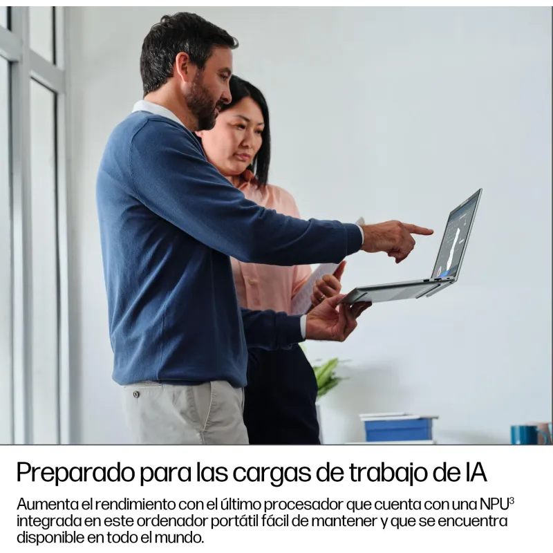 INTELIGENCIA ARTIFICIAL PARA LA PRODUCTIVIDAD EMPRESARIAL: Las experiencias basadas en IA y la conectividad moderna mejoran la productividad del usuario. El ordenador con IA HP EliteBook 6 G1i de 14 pulgadas ofrece una NPU de 11 TOPS[3], una gran seguridad y una capacidad de gestión empresarial en un ordenador sumamente configurable que satisface las exigentes necesidades de los usuarios empresariales.