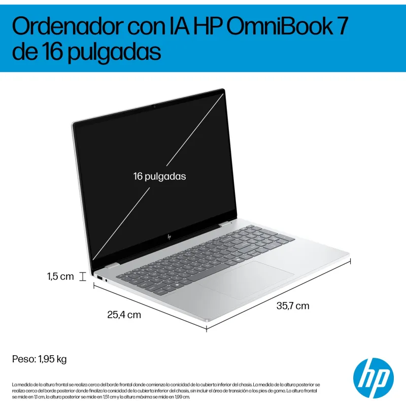 DISEÑO PREMIUM Y AUTONOMÍA PARA TODO EL DÍA: Con un elegante acabado en color plata Glacier silver y un peso de solo 1,91 kg, el Ordenador Portátil HP OmniBook 7 AI 16AY0004NS ofrece portabilidad sin sacrificar potencia. Su batería de 70 Wh proporciona hasta 17 horas de reproducción de vídeo y cuenta con carga rápida que alcanza el 50% en solo 30 minutos. Esto lo convierte en el compañero perfecto para jornadas largas de trabajo o estudio. El teclado retroiluminado de tamaño completo y el touchpad de precisión mejoran la experiencia de uso, mientras que su chasis delgado de 15 mm facilita su transporte. El Ordenador Portátil Hp Omnibook 7 BH5J9EA Intel core ultra combina diseño, autonomía y funcionalidad para adaptarse a cualquier entorno.