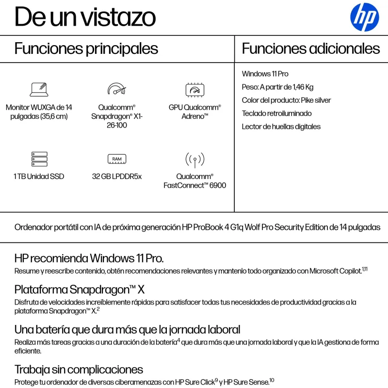 Ordenador Portátil HP ProBook 4 4G1Q CQ0D8ET con memoria 32 GB LPDDR5x, pantalla 14 pulgadas WUXGA, procesador Qualcomm y Windows 11 Pro