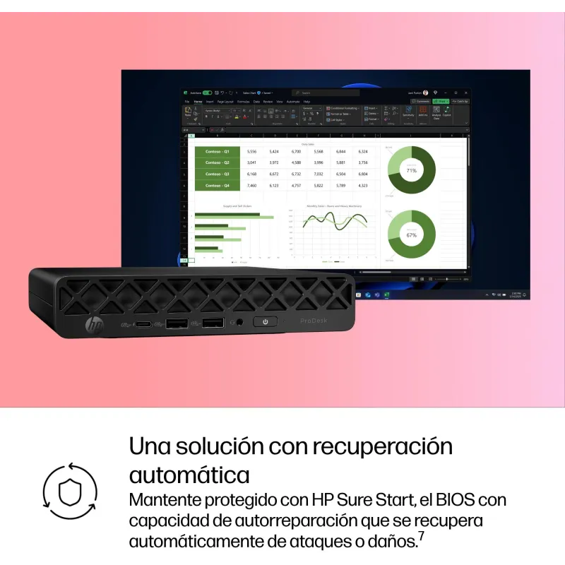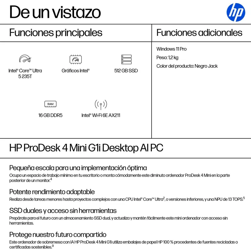 El HP ProDesk 4 Mini G1i (BY7E2ET) es un sobremesa de formato mini PC con orientación profesional. Su configuración combina un Intel Core Ultra 5 235T con 14 núcleos y 14 hilos, 16 GB de RAM DDR5 y un SSD de 512 GB con NVMe. Con este conjunto, el objetivo es un equipo ágil en tareas de oficina y gestión diaria sin ocupar el espacio de una torre.
