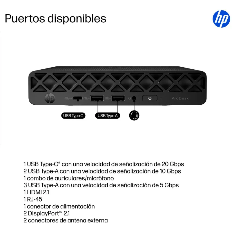 El HP ProDesk 4 Mini G1i BY7E2ET es un PC mini profesional con Intel Core Ultra 5 235T, 16 GB DDR5, SSD NVMe de 512 GB y Windows 11 Pro. Está pensado para puestos de oficina con conectividad Wi‑Fi 6E, Bluetooth 5,3 y Ethernet gigabit.