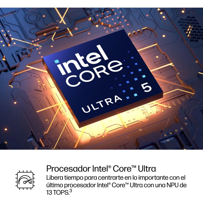 El procesador Intel Core Ultra 5 235T alcanza hasta 5 GHz, lo que ayuda en tareas que dependen de respuesta rápida del sistema y del rendimiento por hilo: apertura de aplicaciones, navegación intensiva, hojas de cálculo y herramientas corporativas. Junto a la CPU, integra NPU Intel AI Boost con 13 TOPs. Esta NPU está pensada para acelerar tareas compatibles, especialmente en funciones relacionadas con colaboración y vídeo cuando las aplicaciones las soportan.