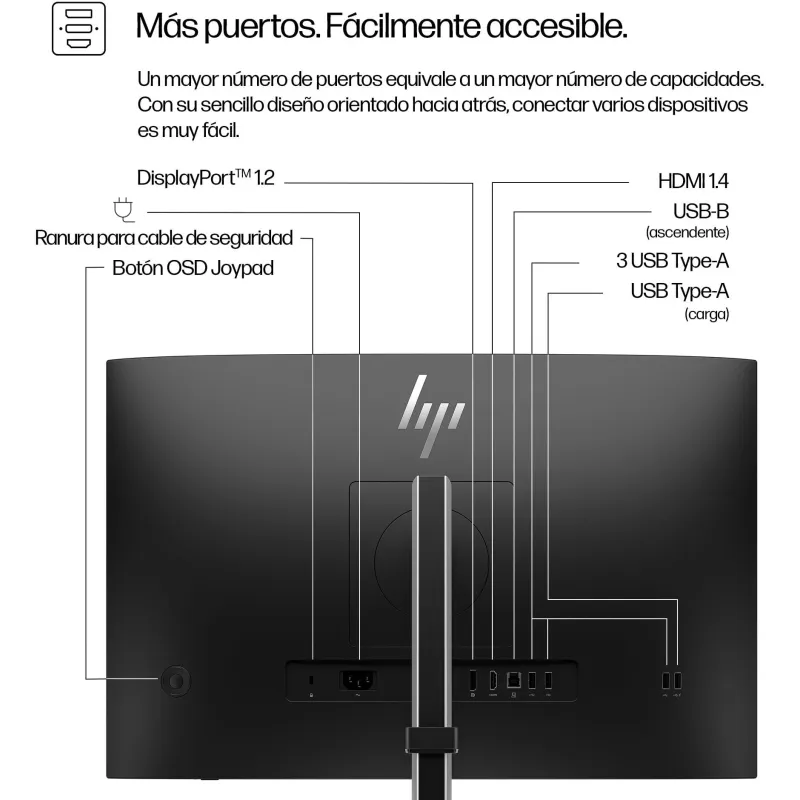 Para integrar periféricos, incorpora HDMI y DisplayPort, además de USB 3.2 Gen 1 con 1 puerto USB-B ascendente y 4 USB-A descendentes. Así puedes centralizar teclado, ratón o receptor inalámbrico en el propio monitor.