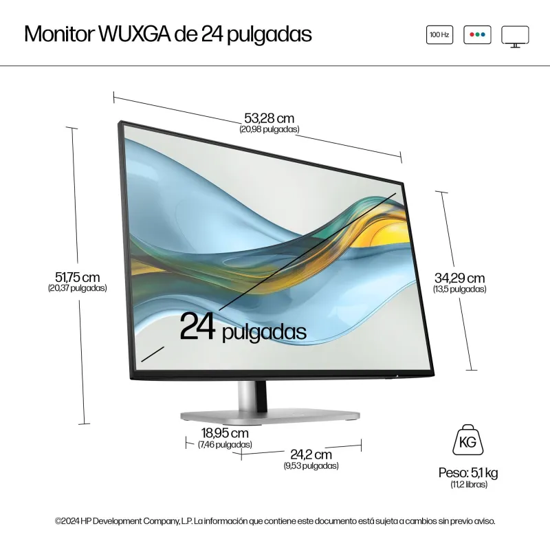 Monitor HP Series 5 Pro 524PN 24" con resolución WUXGA para trabajo diario con panel IPS, 1920 x 1200 y 100 Hz, brillo de 350 nits y ergonomía ajustable.