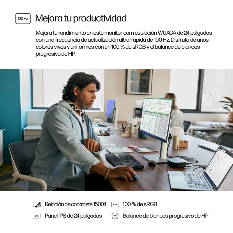 Beneficios clave: 24" con WUXGA 1920 x 1200, relación 16:10, panel IPS LCD, 100 Hz, 350 cd / m², 1500:1 de contraste, 10000000:1 dinámico, 100 % sRGB, 5 ms, antirreflectante, montaje VESA 100 x 100 mm, HDMI + DisplayPort, USB 3.2 Gen 1 con 1× USB-B y 4× USB-A, Flicker Free, Low Blue Light, ajuste en altura e inclinación, giro y pivote