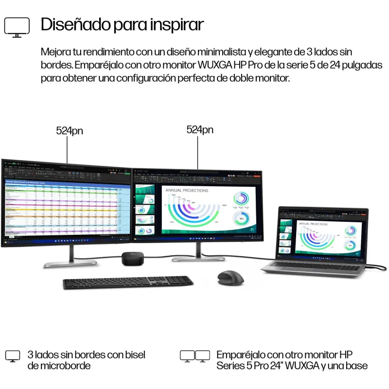 Cuando tu jornada se reparte entre documentos, navegador y herramientas de gestión, HP Series 5 524pn apuesta por un formato 16:10 y WUXGA (1920 x 1200) en 24" para que quepan más líneas y paneles sin forzar zoom.