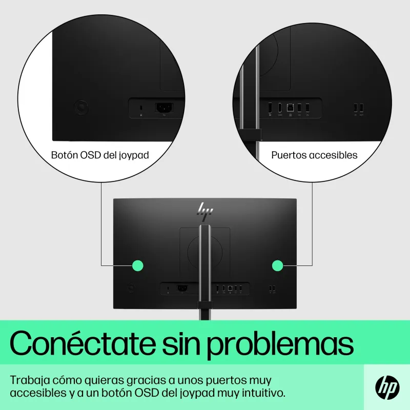 Beneficios clave: 21,5" FHD (1920 x 1080), panel IPS, 75 Hz, 250 nits, 99 % sRGB, antirreflectante, antiparpadeo, low blue light (HP Eye Ease), ajuste de altura e inclinación, giro y pivote, HDMI + DisplayPort, hub USB con 4 USB-A