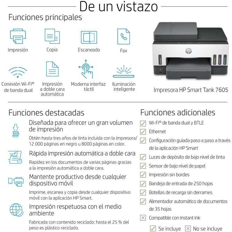 DISEÑO SOSTENIBLE Y EFICIENTE: Con un 25% de plástico reciclado y un bajo consumo energético, esta impresora de Tinta HP Smart Tank 7605 es una opción ecológica y económica.