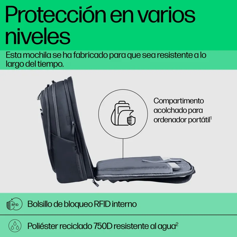 La Mochila HP Travel Plus 30L Gris  está diseñado para usuarios que valoran tanto la compatibilidad como la sostenibilidad. Su diseño universal permite utilizarlo con una amplia variedad de portátiles, siempre que tengan un tamaño máximo de pantalla 17 pulgadas. Esto lo convierte en una solución versátil para diferentes marcas y modelos. Además, su fabricación con material poliéster resistente al agua garantiza una larga vida útil, incluso en condiciones exigentes. El compromiso con el medio ambiente se refleja en su certificación FSC, lo que demuestra que ha sido producido siguiendo criterios responsables. En definitiva, es una mochila que combina tecnología, funcionalidad y conciencia ecológica.