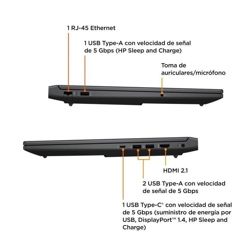 El portátil HP de color Negro con un acabado de pintura y logotipo cromado negro, está diseñado para el mercado de juegos. Presenta una pantalla de 40,9 cm (16.1") Full HD IPS no táctil, con tecnología antirreflectante y Micro-Edge, ofreciendo una experiencia visual nítida con una gama de colores NTSC del 45% y una máxima velocidad de actualización de 144 Hz.