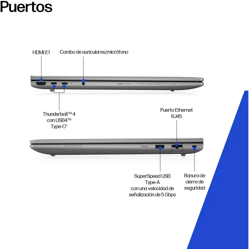 Beneficios clave: Intel Core Ultra 7 265H, 32 GB DDR5, SSD NVMe, NVIDIA RTX 500 Ada 4 GB GDDR6, Intel Arc 140T, pantalla 16" WUXGA táctil antirreflectante, brillo 300 cd/m², Wi-Fi 7 + Bluetooth 5.4, 2× Thunderbolt 4, HDMI 2.1, Ethernet RJ?45, Windows 11 Pro, batería 77 Wh