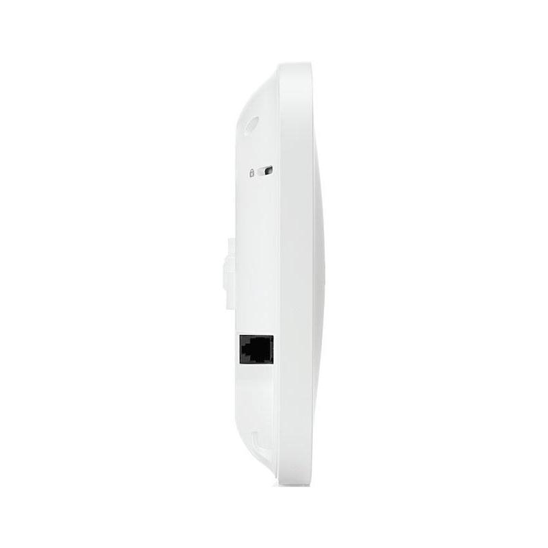 Otras características destacadas incluyen su antena interna omni-direccional con una ganancia máxima de 5,6 dBi, que asegura una cobertura amplia y uniforme. Además, el puerto Ethernet LAN de alta velocidad (10/100/1000 Mbit/s) facilita conexiones cableadas rápidas y confiables. Su diseño en color blanco, con soporte para ranuras de seguridad Kensington, lo hace no solo funcional, sino también estéticamente agradable y seguro.