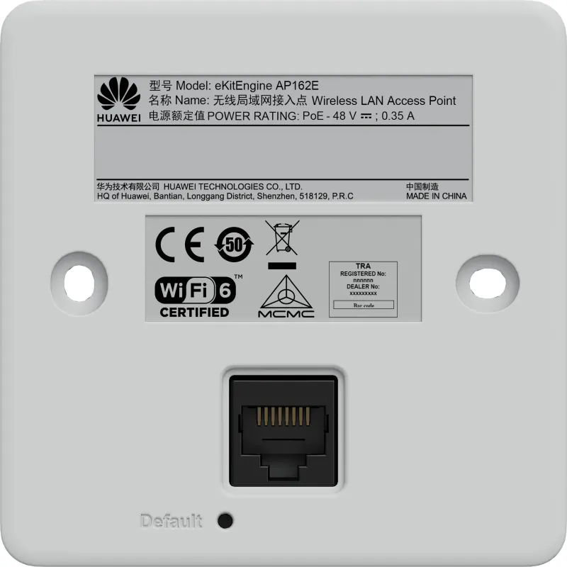 HUAWEI EKITENGINE AP162E: Huawei eKitEngine AP162E es un punto de acceso (AP) de placa de pared 86x86 que cumple con el estándar Wi-Fi 6 (802.11ax). Puede proporcionar servicios simultáneamente en las bandas de frecuencia de 2.4 GHz (2x2 MIMO) y 5 GHz (2x2 MIMO) con cuatro flujos espaciales, ofreciendo una velocidad de datos de hasta 2.975 Gbps.