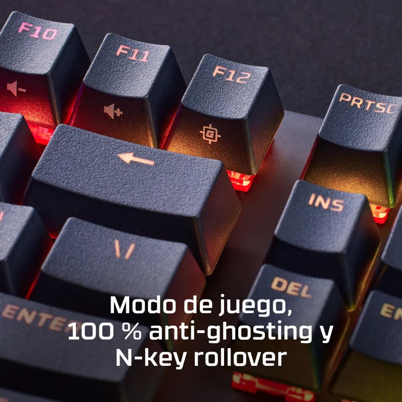 INTERRUPTORES MECÁNICOS HYPERX RED PARA RESPUESTA ULTRARRÁPIDA: Con interruptores mecánicos HyperX Red, el Teclado HyperX Alloy Origins PBT HX 639N3AA ofrece una pulsación lineal y silenciosa, ideal para juegos que requieren velocidad y precisión. Estos interruptores tienen una fuerza de actuación de 45 gramos y una vida útil de hasta 80 millones de pulsaciones, lo que garantiza una experiencia de juego fluida y duradera. Además, su tecnología N-key rollover asegura que cada tecla se registre correctamente, incluso al presionar varias simultáneamente. Este tipo de interruptor es perfecto para jugadores profesionales que buscan rendimiento sin distracciones ni errores de entrada.