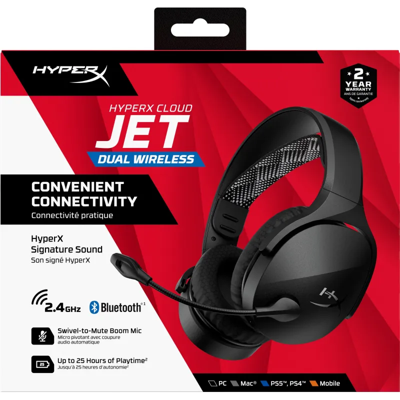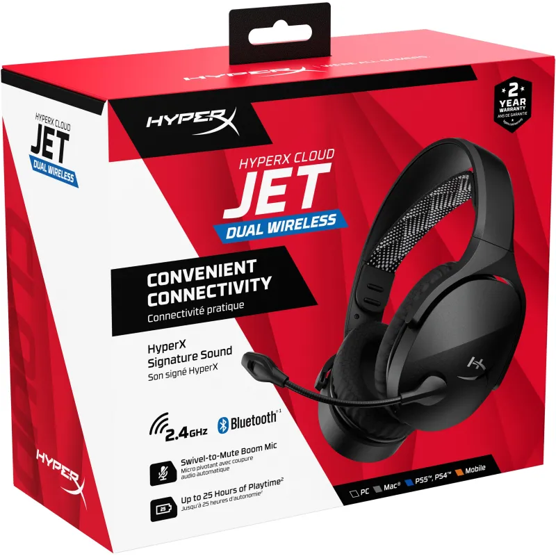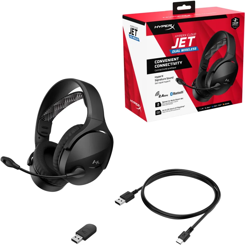 DISEÑO ELEGANTE. EXPERIENCIA MEJORADA:Diseñados tanto para jugadores principiantes como para quienes buscan mejorar su equipo básico, los auriculares inalámbricos duales HyperX Cloud Jet ofrecen una experiencia impecable con conectividad de 2,4 GHz y Bluetooth 5.2. Alterna sin esfuerzo entre ordenador, consola y dispositivos móviles mientras disfrutas del audio enriquecido que ofrecen los transductores de 40 mm para una experiencia de juego inmersiva. Mantén la conexión gracias a un micrófono que se silencia con un simple giro y que garantiza una comunicación clara con tu escuadrón. Con hasta 25 horas de autonomía[1], podrás sumergirte en largas sesiones de juego sin interrupciones. Los controles integrados permiten ajustar el volumen, silenciar el micrófono y alternar entre conexiones con facilidad. Además, su diseño ligero, sus almohadillas de malla transpirable y su diadema con suspensión elástica te ofrecen la máxima comodidad para tus sesiones maratonianas de juego. ¡Mejora tu experiencia de juego con HyperX Cloud Jet!