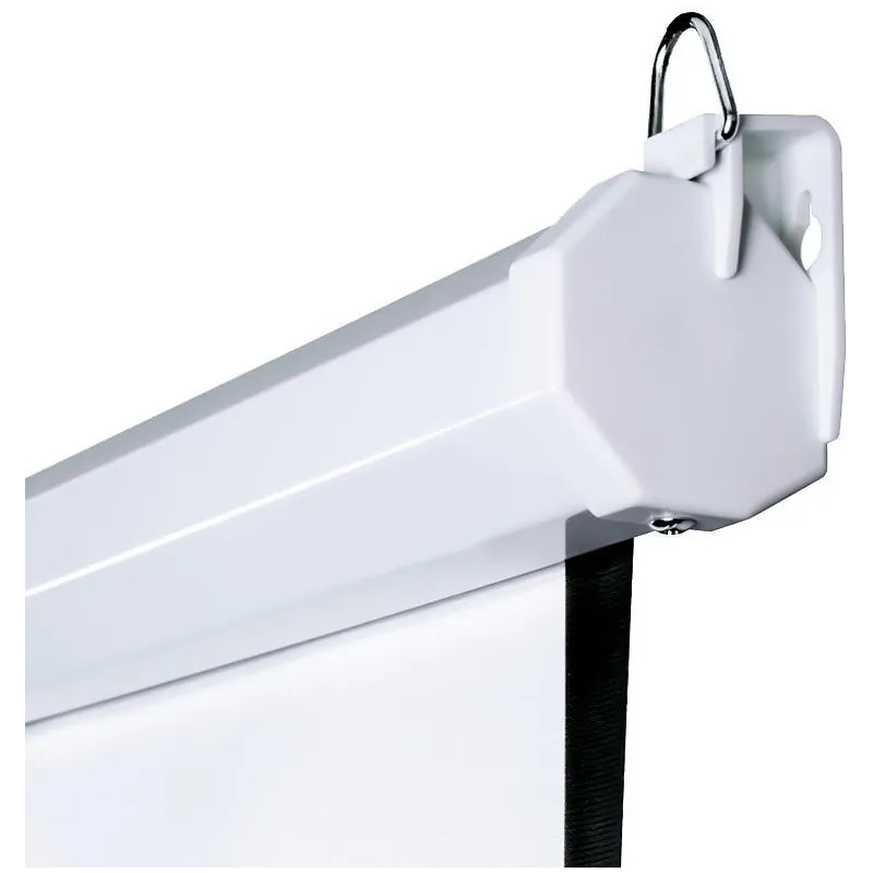 El diseño es versátil y elegante, permitiendo su montaje tanto en techo como en pared. Con un fotograma enrollable y soporte negro, esta pantalla se integra perfectamente en cualquier espacio. Disponible en color blanco con detalles en negro, es una opción sofisticada para tu hogar o negocio.