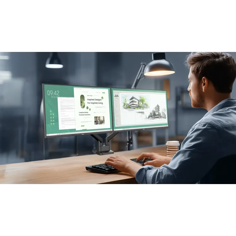 Fácil de integrar en brazos o soportes para liberar mesa o montar doble monitor alineado.