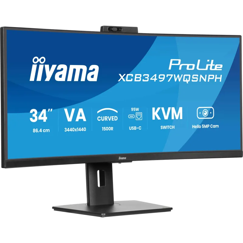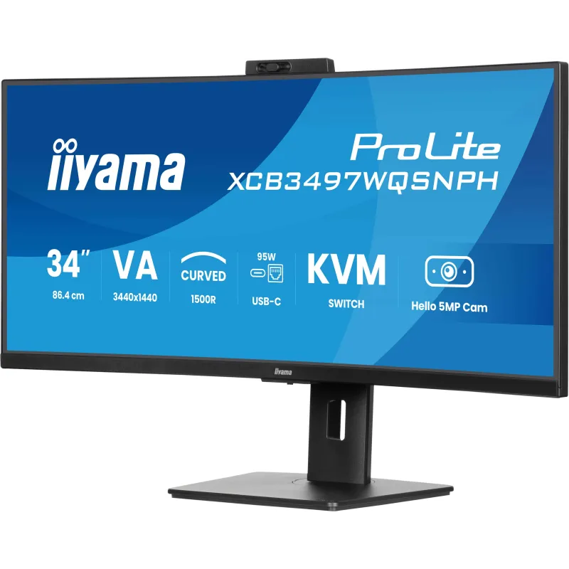 MONITOR CURVO DE 34'' VA UWQHD CON CÁMARA Y MICRÓFONO INTEGRADOS DE WINDOWS HELLO, DOCK USB-C, LAN, INTERRUPTOR KVM Y SOPORTE AJUSTABLE EN ALTURA DE 15CM: Conoce el XCB3497WQSNPH — un monitor curvo todo en uno de 34" diseñado para una eficiencia sin esfuerzo. Con un interruptor KVM integrado y un dock USB-C, puedes controlar sin problemas múltiples dispositivos y conectar tu portátil con un solo cable. El vibrante panel VA ofrece colores impresionantes, un contraste profundo y amplios ángulos de visión para una experiencia inmersiva. Además, características inteligentes como una cámara web de enfoque automático de 5MP con Windows Hello, un soporte ergonómico ajustable en altura y tecnologías de cuidado ocular te mantienen cómodo y productivo todo el día.