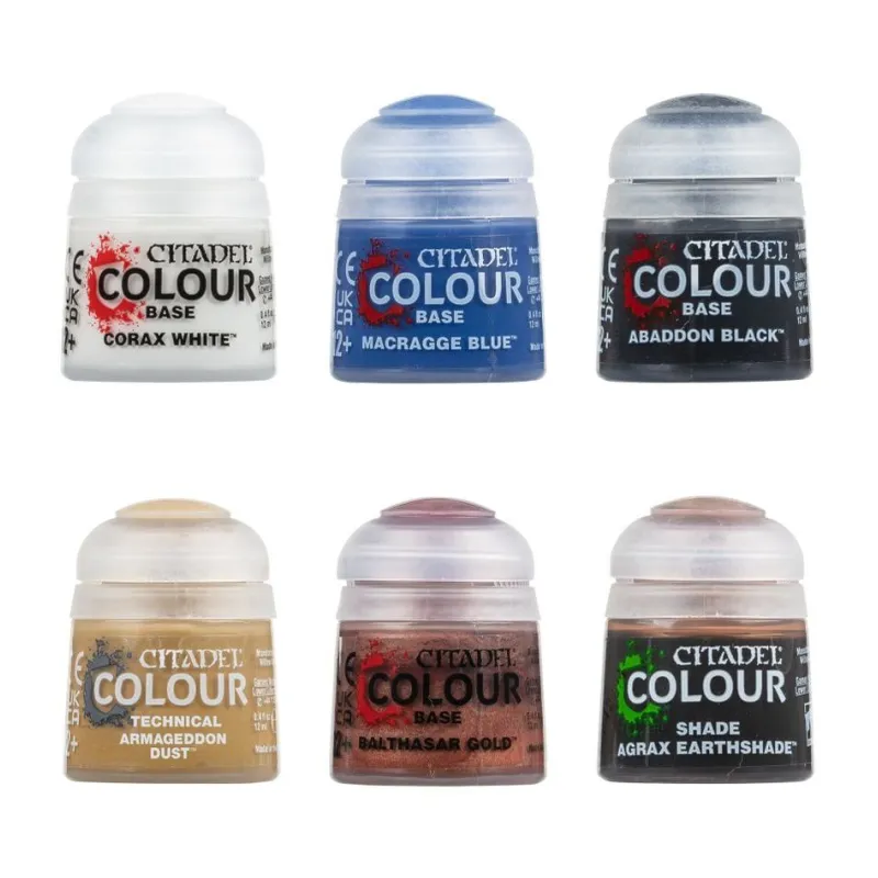 La gama de botes Citadel Colour incluida ofrece colores clave para armaduras, detalles y armas, permitiendo completar un esquema de color básico sin tener que confeccionar una lista de pinturas desde cero, algo especialmente útil cuando se compra la primera caja de hobby.