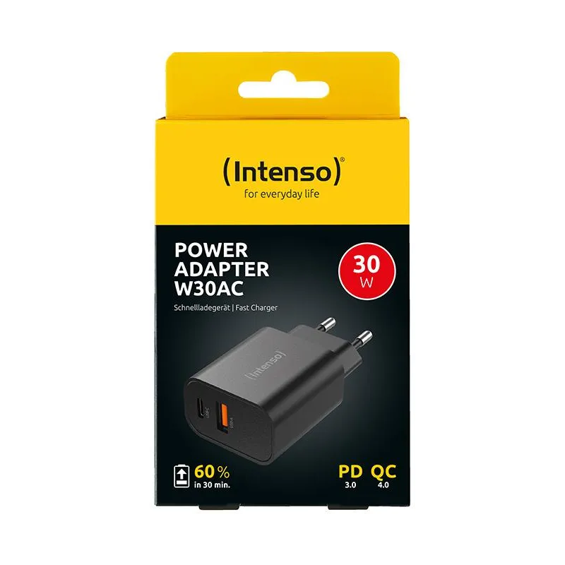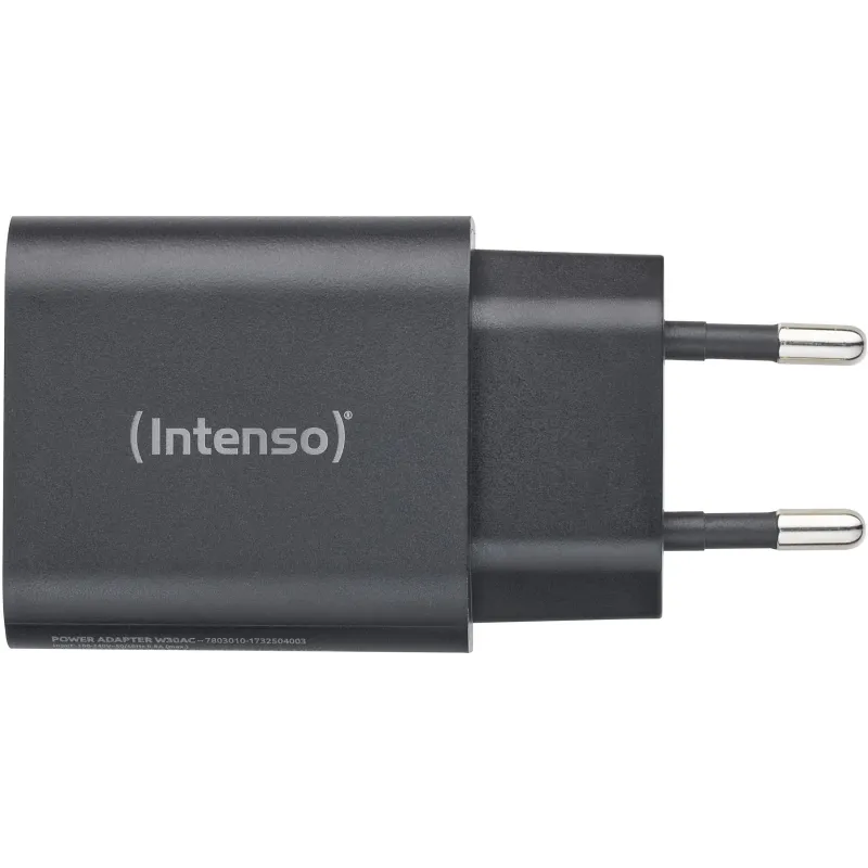 Cargador de Pared W30AC Intenso 7803010: Potencia de carga Rápida 30 W, salida 20 V, entrada 120-140 V y 50/60 Hz. Cargador negro para uso diario.