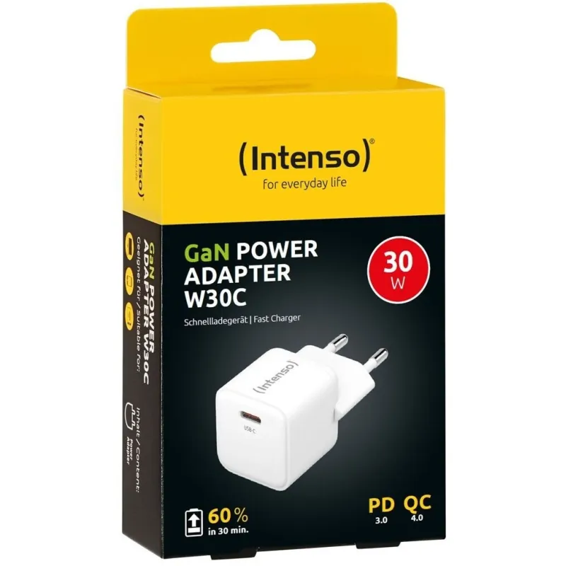 Cargador de Móvil: Intenso 7803062. Cargador rápido GaN de 30 W con USB-C, compatibilidad PD 3.0/PPS/QC 4.0 y entrada 100-240 V.