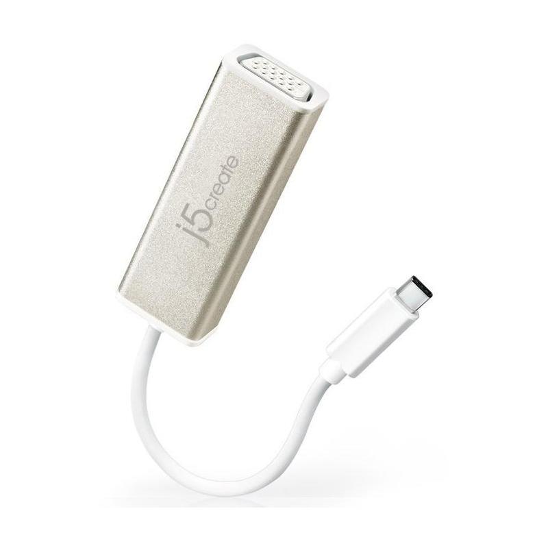Adaptador j5create JCA111 USB-C a VGA con resolución máxima de 1920x1080 a 60 Hz, diseño compacto en aluminio y blanco
