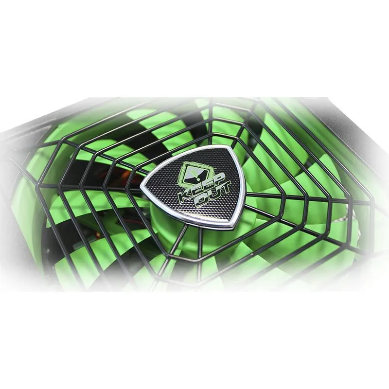 El diseño incluye un color negro y verde, un ventilador de 14 cm ubicado en la parte superior para una refrigeración eficiente, y un interruptor de encendido/apagado integrado para mayor conveniencia. Con un peso de solo 1,3 kg, es fácil de manejar e instalar.