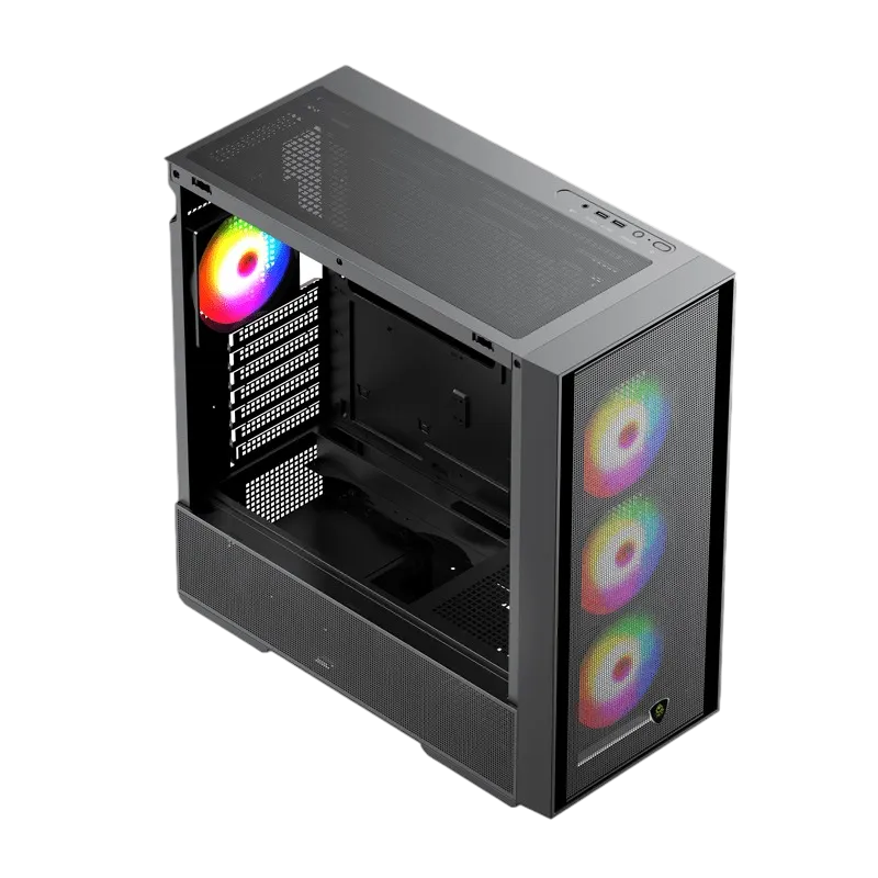 Beneficios clave: formato MicroATX, frontal mesh de alto flujo, estética ARGB, USB 3.0 frontal, color negro, chasis compacto, enfoque gaming/escritorio, diseño pensado para buen aire