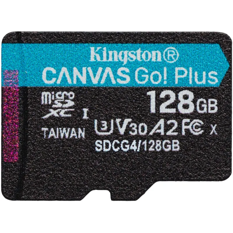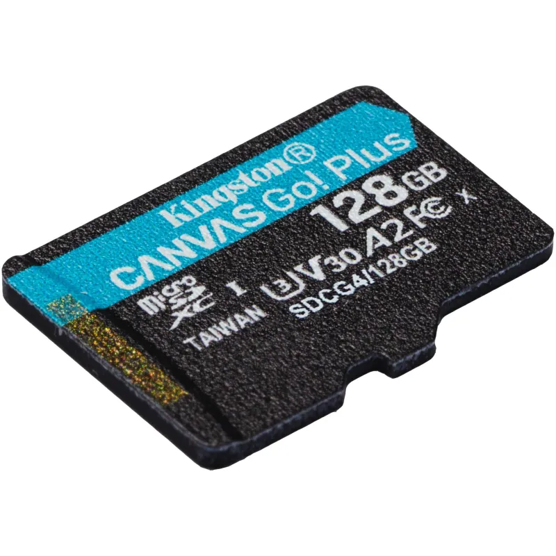 Tarjeta de Memoria Kingston Canvas Go! Plus SDCG4/128GB UHS-I U3 V30 A2 lectura 200 MB/s resistente incluye adaptador SD ideal para video 4K.