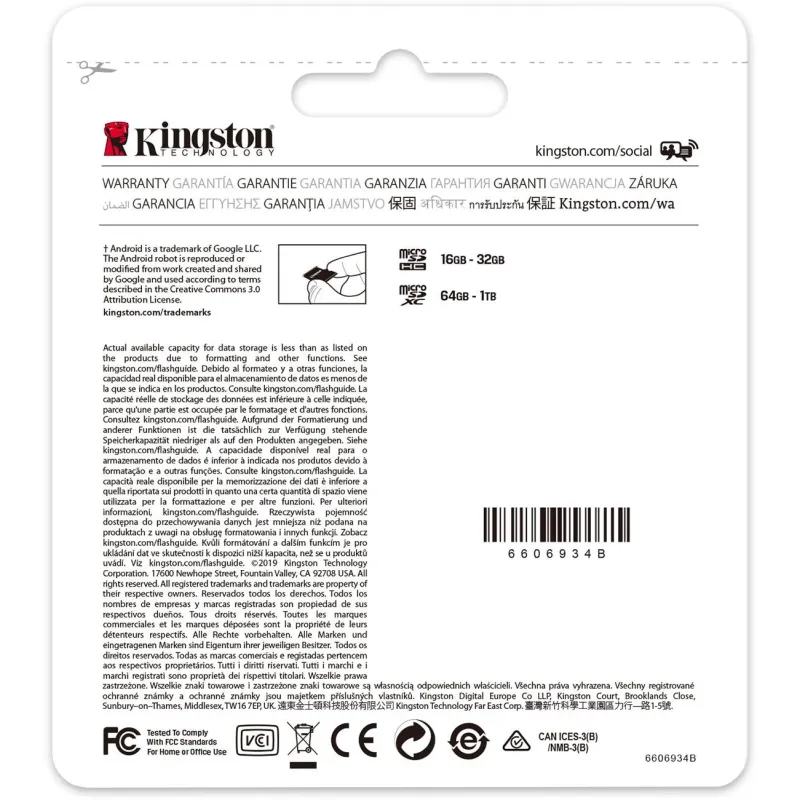 CANVAS SELECT PLUS MICROSD TARJETA DE MEMORIA CON RENDIMIENTO ANDROID DE NIVEL A1: Las tarjetas microSD Canvas Select Plus de Kingston son compatibles con dispositivos Android y han sido diseñadas para un rendimiento de nivel A1. Se caracteriza por una mayor velocidad y capacidad para cargar más rápido las aplicaciones, así como para capturar imágenes y vídeos de múltiples capacidades hasta 512 GB1. Excelentes en rendimiento, velocidad y durabilidad, las tarjeas microSD Canvas Select Plus han sido diseñadas para una alta fiabilidad al tomar fotos y filmar imágenes, así como para editar vídeos de alta definición. Las tarjetas Canvas de Kingston han sido sometidas a exhaustivas pruebas en los más rigurosos entornos y condiciones, con el objeto de que pueda llevarlas consigo con la confianza de que sus fotos, vídeos y archivos estarán protegidos. Disponibles con garantía vitalicia.