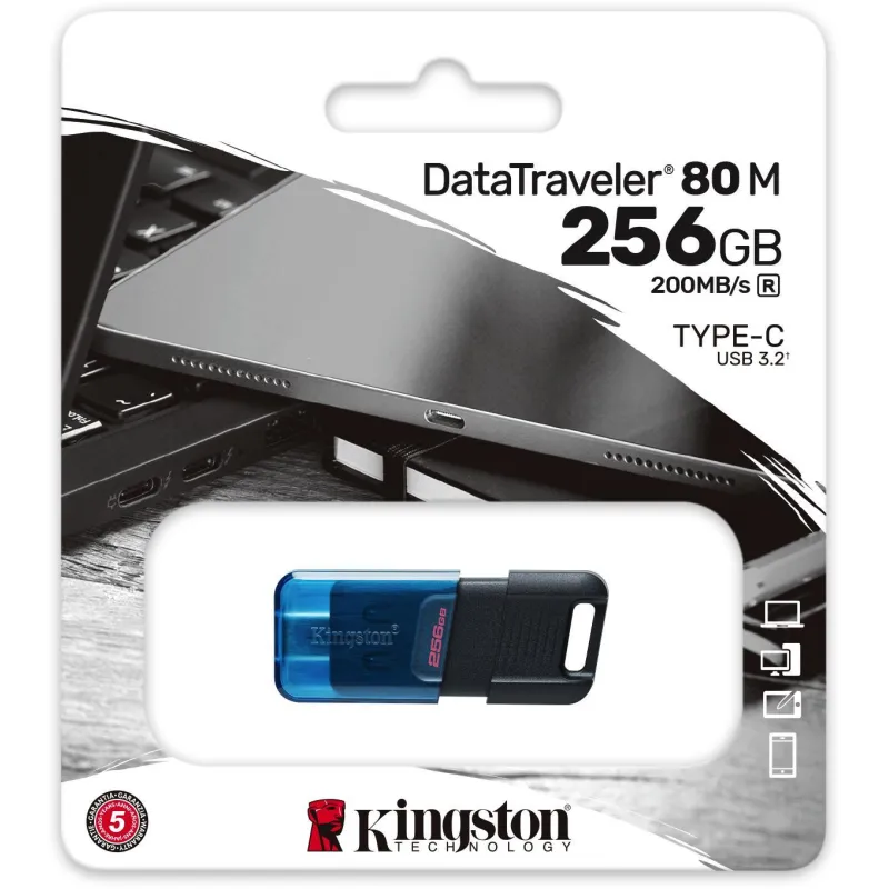 RENDIMIENTO DE ALTA VELOCIDAD: Kingston DataTraveler® 80 M es una unidad flash de alto rendimiento diseñada para trabajar con laptops, escritorios, teléfonos inteligentes y tabletas con USB Tipo-C* sin necesidad de un adaptador. Con velocidades de lectura extremadamente rápidas de hasta 200MB/s, el DataTraveler® 80 M permite un almacenamiento y transferencia de archivos rápidos y convenientes. El diseño compacto con tapa móvil presenta un lazo para llavero, lo que lo hace ideal para almacenamiento en movimiento.
