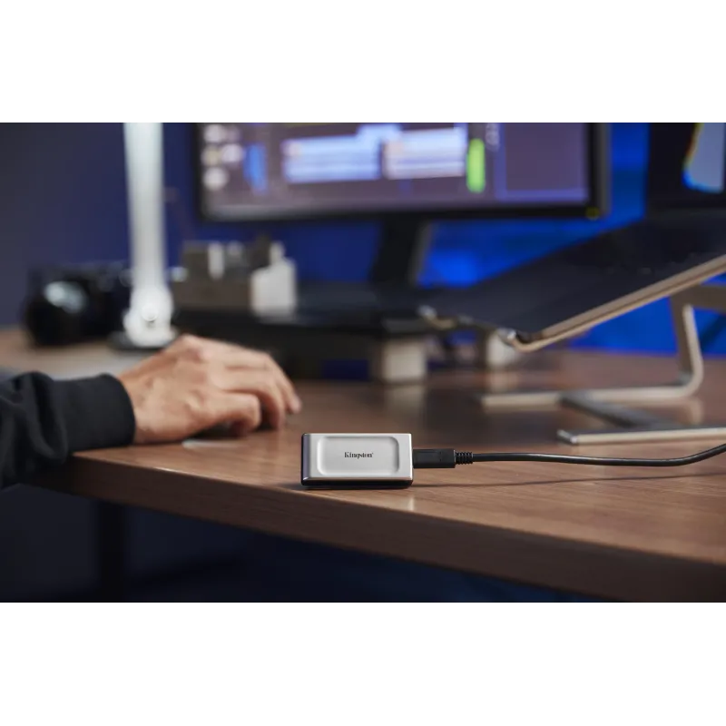 RENDIMIENTO USB 3.2 GEN 2X2: El SSD portátil XS2000 de Kingston utiliza velocidades USB 3.2 Gen 2x2 para ofrecer un rendimiento de próxima generación en una unidad externa compacta. Con velocidades de transferencia ultrarrápidas de hasta 2,000MB/s, el XS2000 proporciona una mayor productividad con mínimas interrupciones. El XS2000 ofrece opciones de almacenamiento de alta velocidad de hasta 4TB para descargar y editar imágenes de alta resolución, videos 8K y documentos grandes en un instante. La unidad está preparada para el futuro para mantenerse al día con las demandas de almacenamiento y es compatible con la mayoría de los dispositivos desde el primer momento. Se conecta con USB Type-C®, lo que permite a los creadores de contenido acceder a sus datos en cualquier lugar, ya sea en una PC o en un dispositivo móvil. Ya sea que te muevas entre el trabajo, el juego y proyectos de pasión, el XS2000 incluye una funda removible y una clasificación IP55 para resistir el agua y el polvo, lo que lo convierte en el compañero perfecto para sesiones fotográficas en exteriores o aventuras.