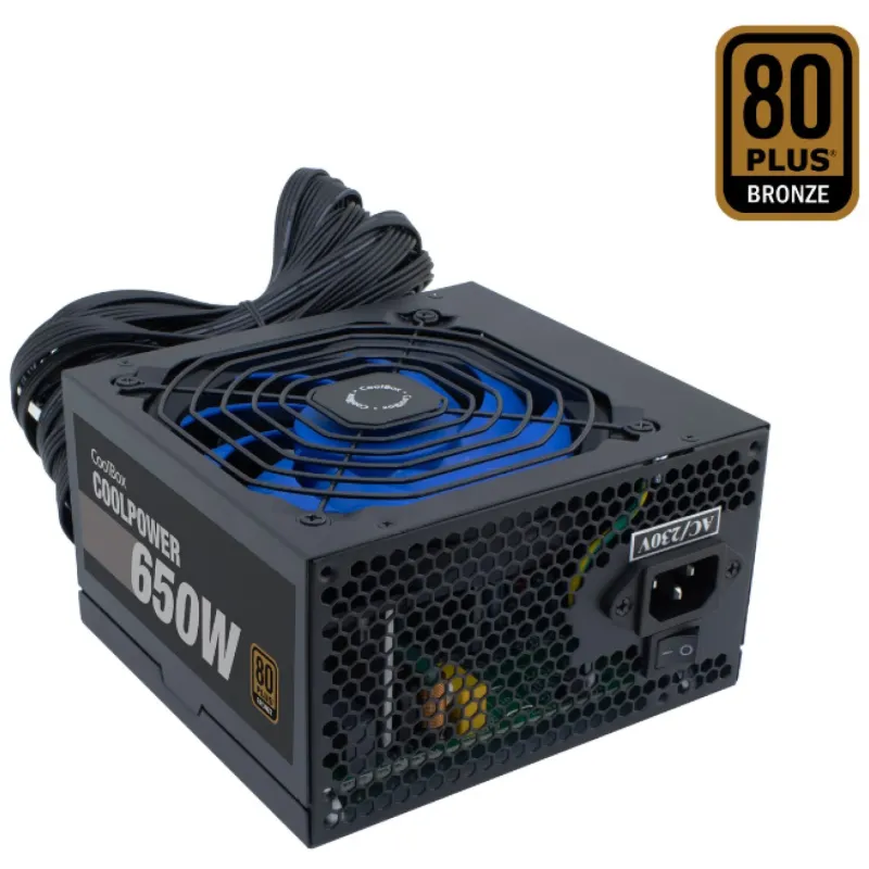 Fuente ATX: CoolBox CoolPower 650W, ATX12V Bronze. Fuente ATX12V 650 W con 80 Plus Bronze, 2 PCIe 6+2 y ventilador 120 mm. Para PC con GPU.