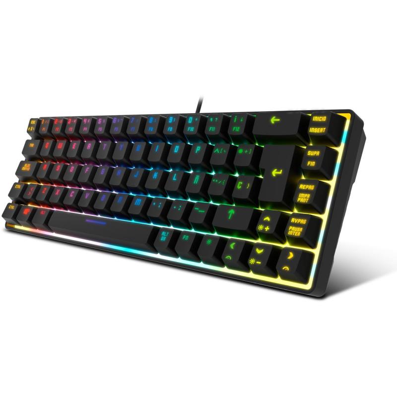 La retroiluminación LED RGB ajustable añade un toque de estilo a tu setup, permitiéndote personalizar el ambiente de tu espacio de juego. A pesar de su tamaño compacto, incluye teclas multimedia y teclas de Windows, facilitando el acceso rápido a funciones esenciales durante tus partidas. El teclado, de color negro monocromo, se integra elegantemente en cualquier entorno, manteniendo un aspecto profesional.