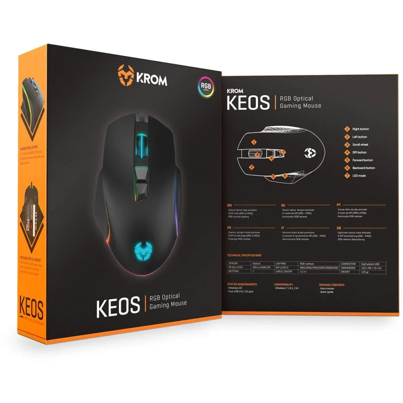 Keos: Tiene todo lo que buscas en un ratón. Con potente iluminación RGB y un diseño ergonómico, que asegura libertad de movimiento, facilita una respuesta precisa y rápida a cualquier acción, alcanzando los 6400 DPI, lo que lo convierte en la herramienta perfecta para hacerte con la victoria.