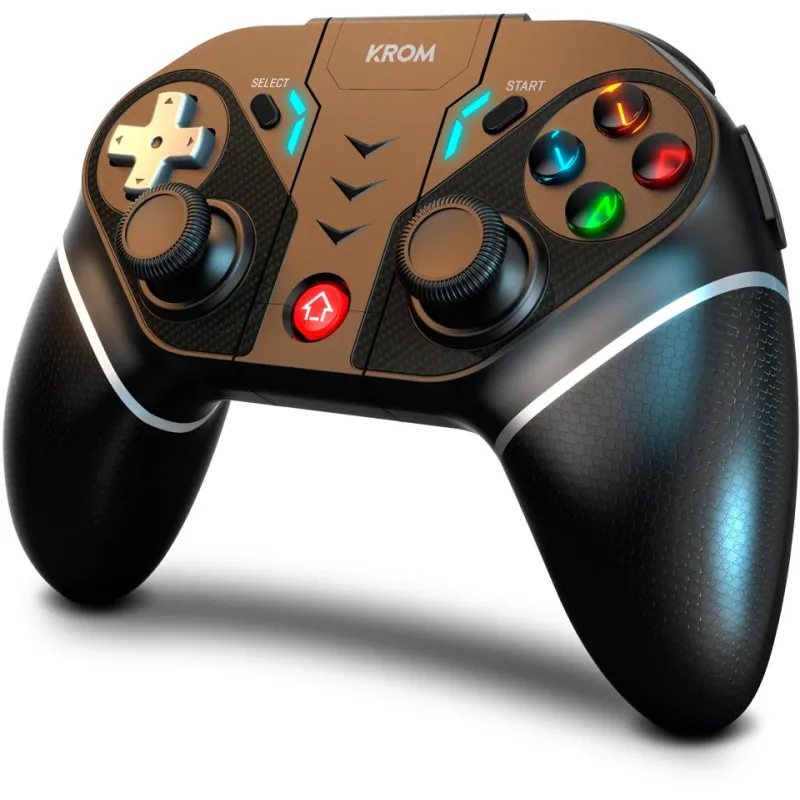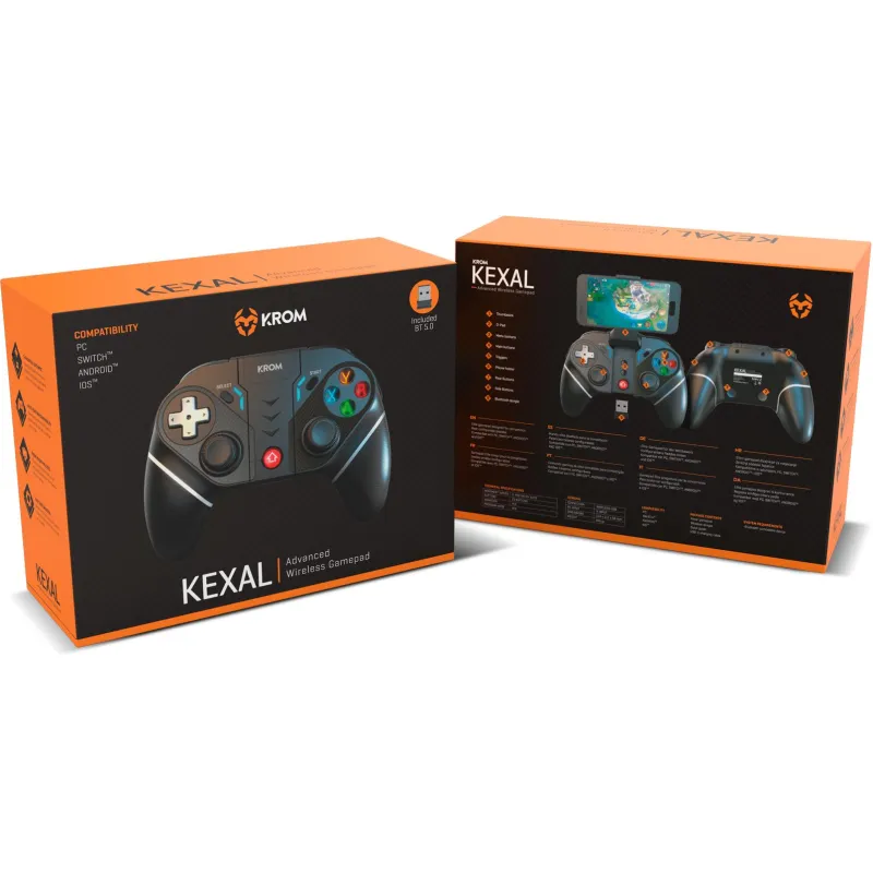 KROM KEXAL: CALIDAD Y BUEN RENDIMIENTO Krom Kexal es un gamepad inalámbrico con Bluetooth 5.0 y un receptor inalámbrico de 2.4 GHz, ofreciendo calidad y buen rendimiento. Compatible con PC, Nintendo Switch™ y smartphones, te ayudará a mejorar tu rendimiento. Botones totalmente personalizables y motores de vibración dual te permiten disfrutar de una experiencia de juego superior.