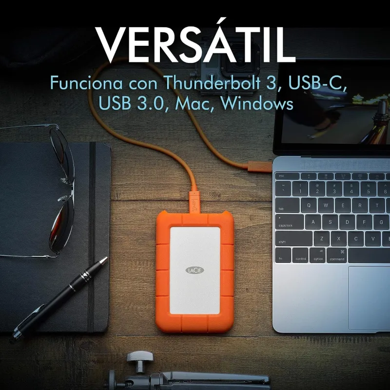 COMPATIBLE CON THUNDERBOLT, USB-C Y USB 3.0: Escenario común: necesita editar y entregarle un proyecto a un cliente, pero usa una Macbook Pro con USB-C y el cliente tiene una computadora con USB 3.0. ¿Qué hace? Sencillo: opte por Rugged. La línea de unidades se amolda a una amplia gama de interfaces de modo que pueda editar y compartir sin complicaciones.