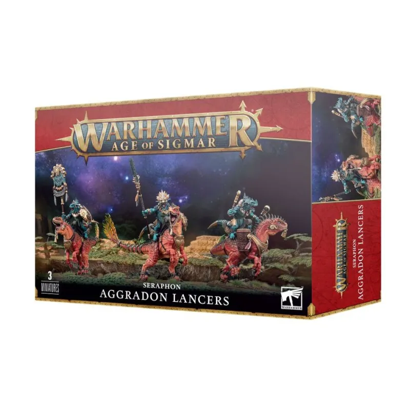 La caja incluye miniaturas de Seraphon montados en robustos Agradones, con armamento de asta y armaduras detalladas, pensadas tanto para listas centradas en el combate cuerpo a cuerpo como para coleccionistas que disfrutan con esquemas de pintura de reptiles y escamas.