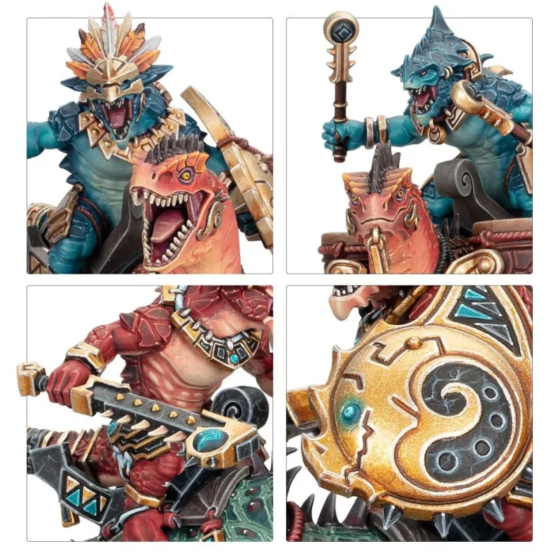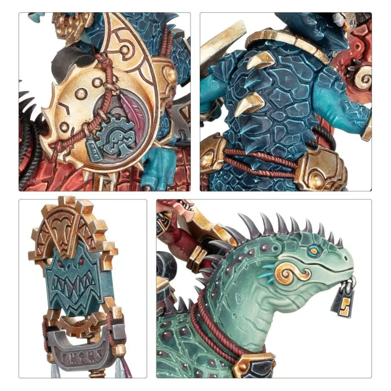 Las monturas muestran escamas, placas óseas y armaduras que dan mucho juego a nivel de pintura, combinando zonas amplias para degradados con detalles finos para técnicas como pincel seco y perfilados, ideales para quien quiere que su ejército Seraphon destaque visualmente.