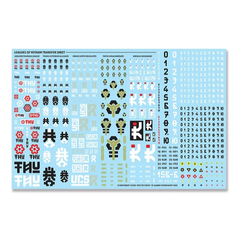 - Calcomanias: Si. 555 calcomanías al agua de gran calidad de la Ligas de los Votann