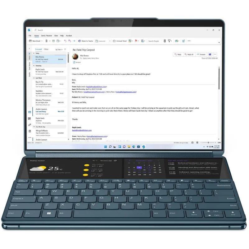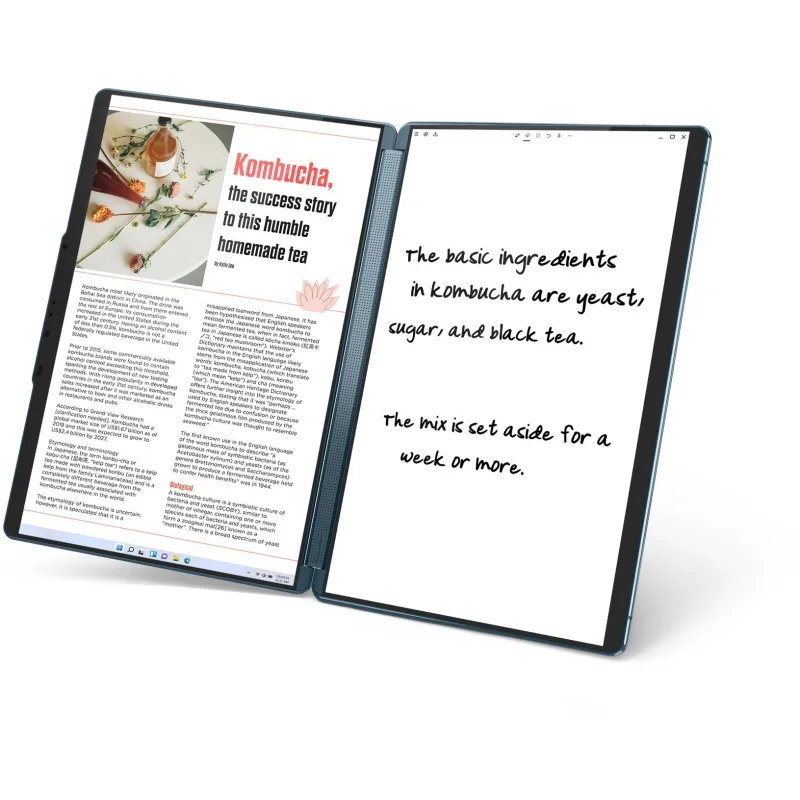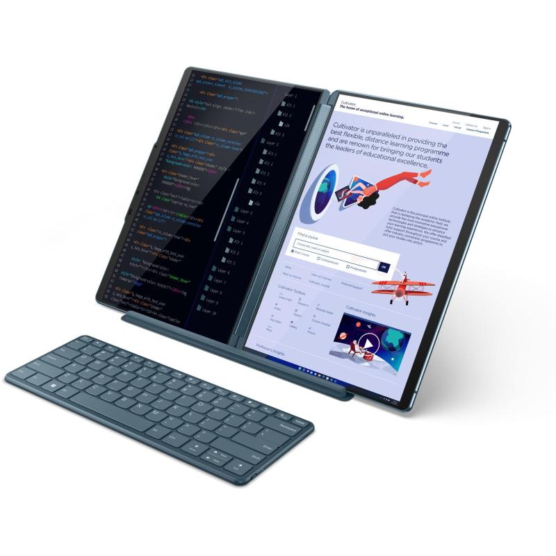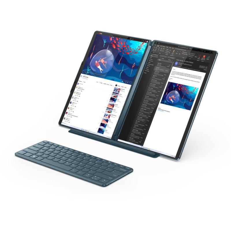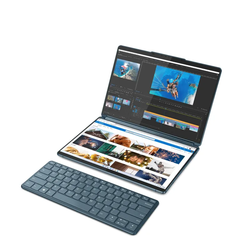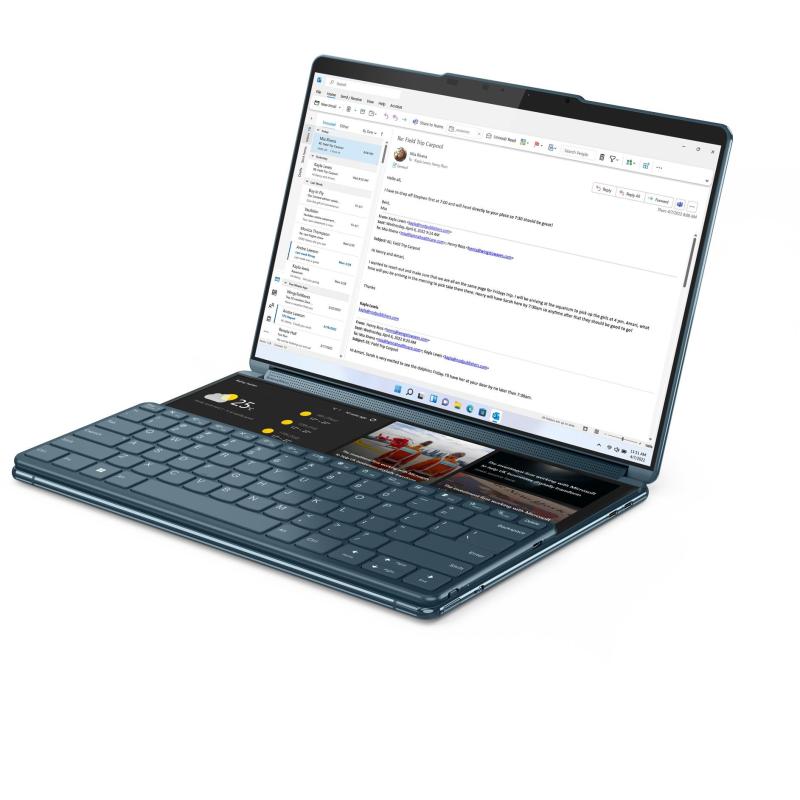 El nuevo dispositivo híbrido en color Tidal Teal combina la elegancia del aluminio con la versatilidad de un diseño convertible y una pantalla doble plegable. Su impresionante pantalla OLED de 13.3 pulgadas ofrece una resolución de 2880 x 1800 Pixeles en 2.8K, con tecnología Dolby Vision HDR y una gama de colores del 100% DCI-P3, asegurando una experiencia visual excepcional con un brillo de 400 cd/m².