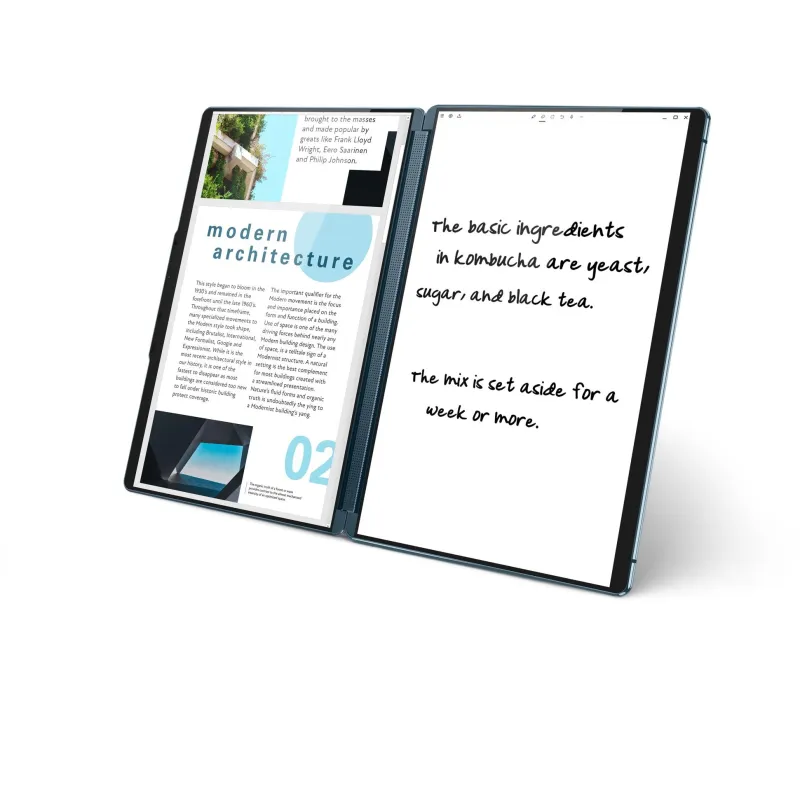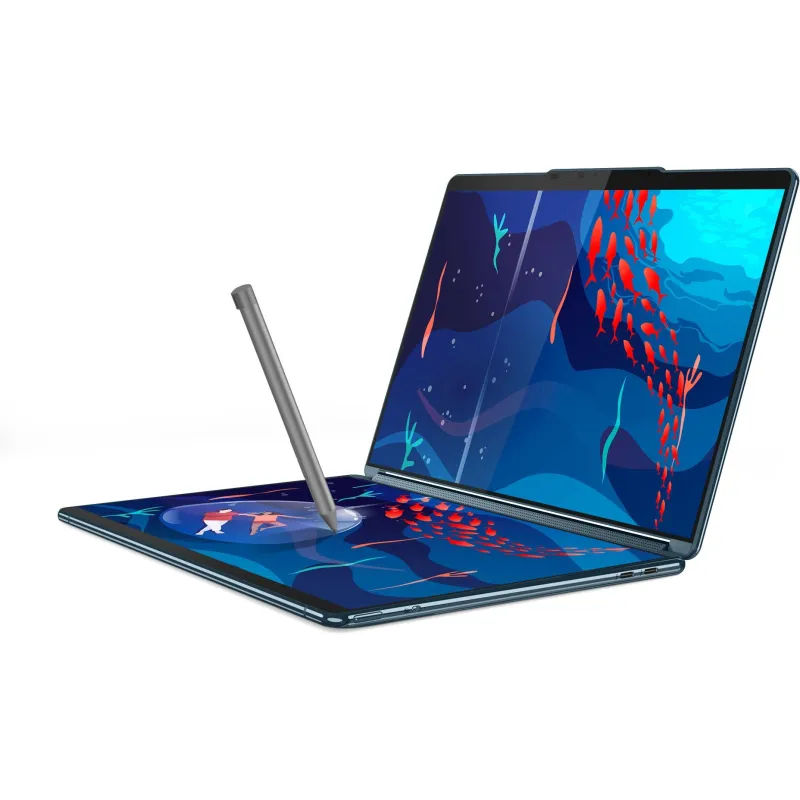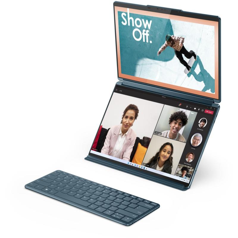 VER PARA CREER: El portátil Yoga Book 9i de 8.ª generación abre un nuevo capítulo en cuanto a versatilidad de dispositivos con experiencias de software únicas para trabajar, aprender, transmitir, jugar y mucho más. Además, los altavoces Bowers & Wilkins suman un valor adicional al entretenimiento con todo lujo de detalles, entre ellos, un Active Pen del mismo color, un teclado Bluetooth y un soporte tipo folio Tidal Teal. ¿Te gustaría navegar por ambas pantallas únicamente con el Active Pen? Está en tu mano. ¿Quieres apoyarlo y hacerte una maratón de tus programas favoritos ? Sin problema. ¡Libera tota tu creatividad interior como nunca antes lo habías hecho!