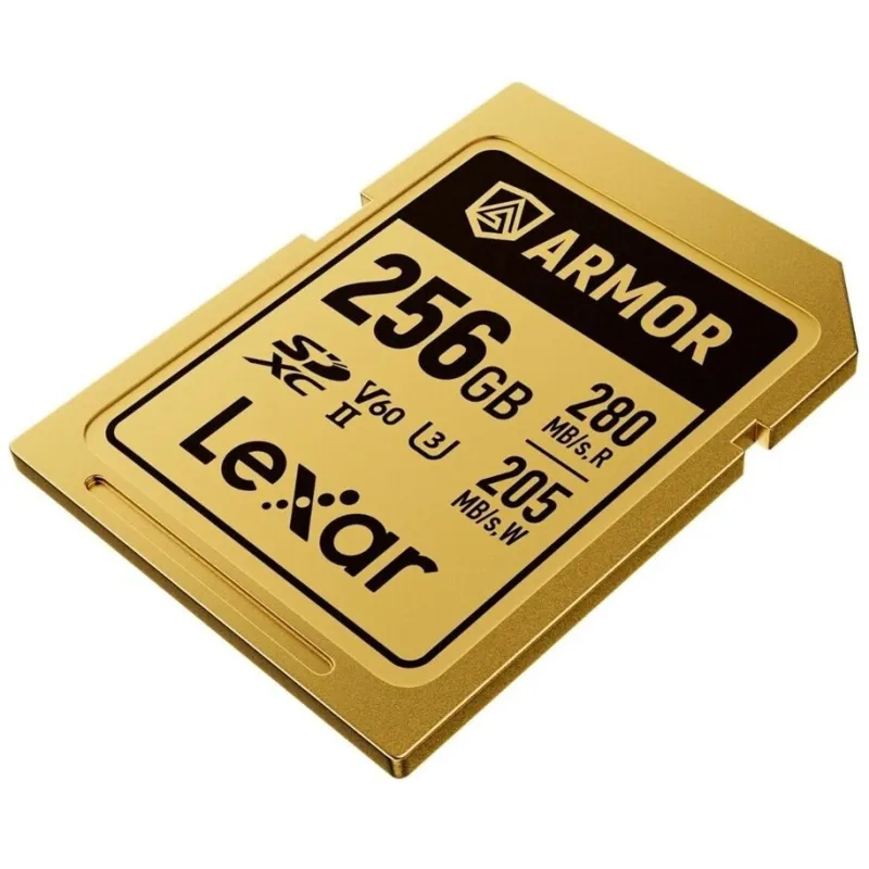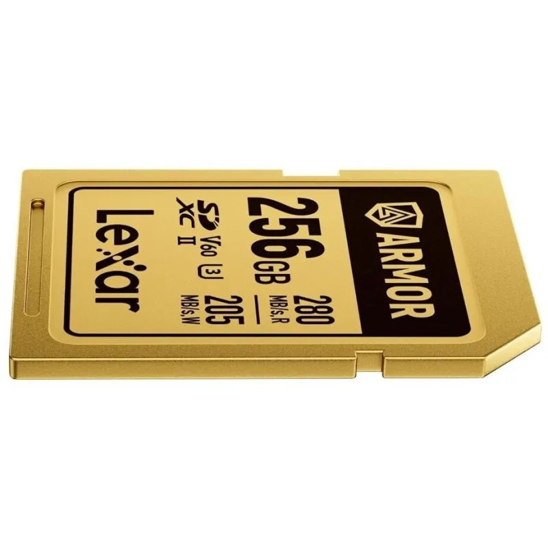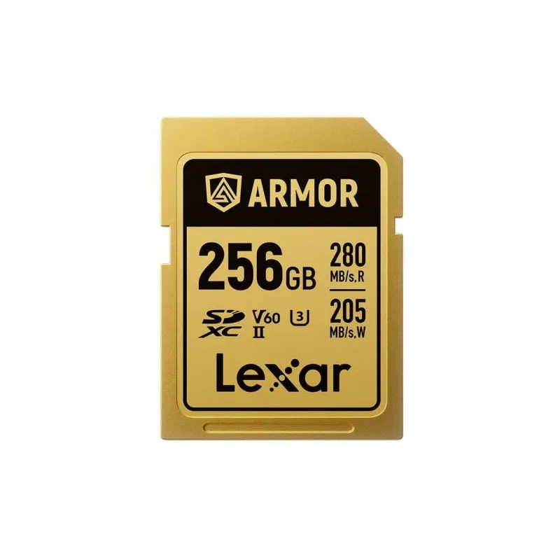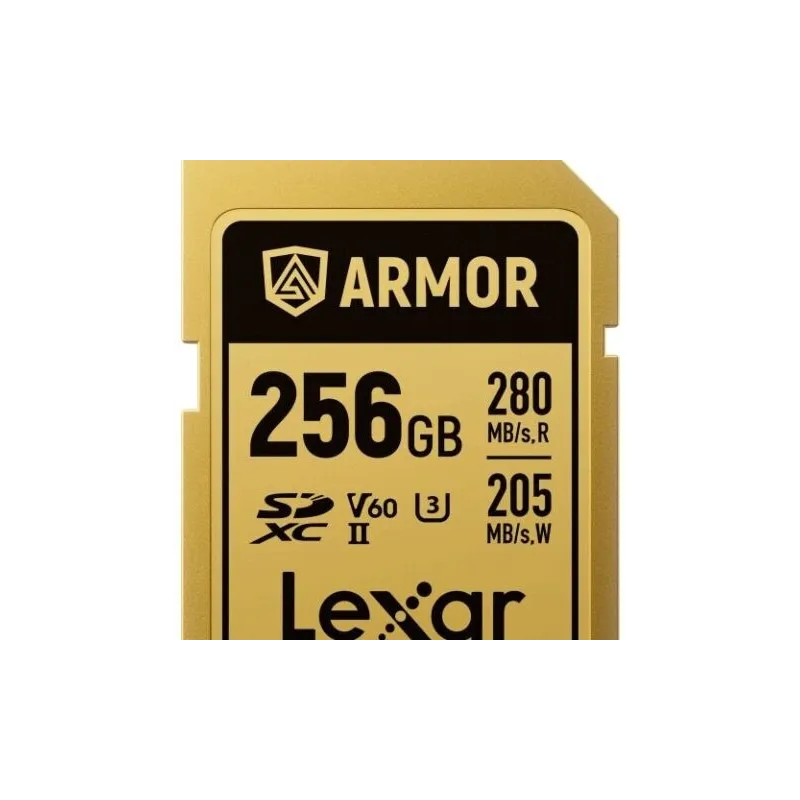 Cuando disparas ráfagas largas o grabas vídeo durante horas, la Lexar Professional Armor Gold Pro SDXC UHS II 256GB te da margen de trabajo con su capacidad de 256 GB, su velocidad de lectura de hasta 280 MB/s y su clasificación V60 pensada para flujos de datos constantes.