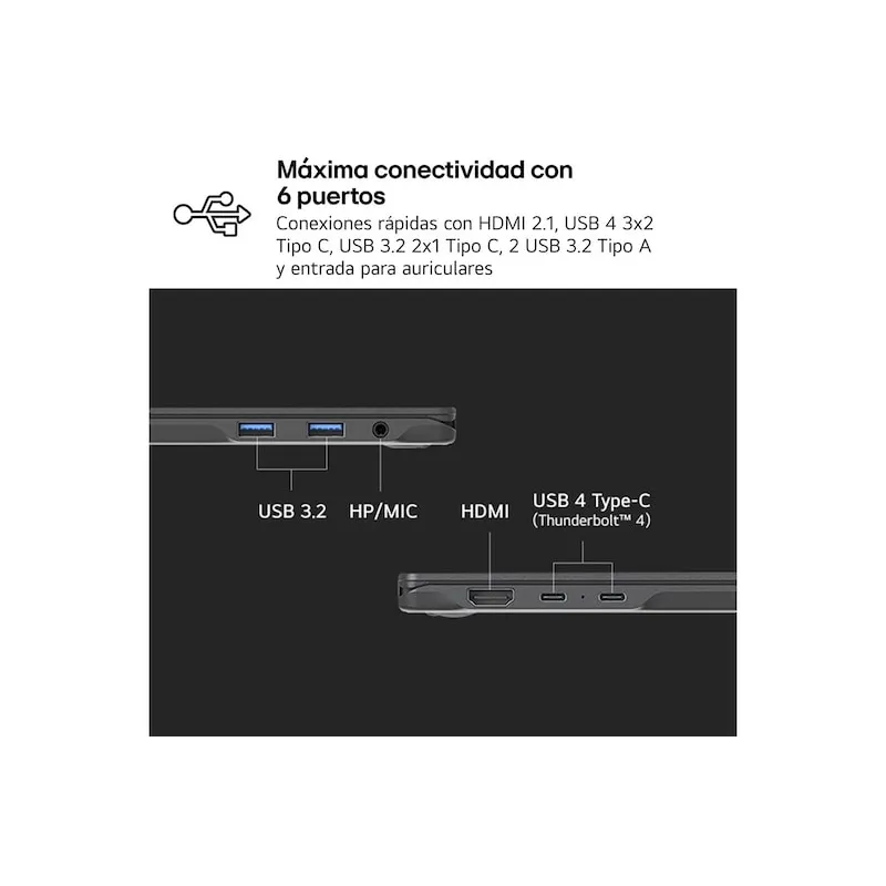 Para conectarlo a tu mesa, la conectividad está planteada para monitores y docks actuales: HDMI 2.1 y dos USB-C con DisplayPort, con un USB4 Gen3x2 que integra Thunderbolt 4; a esto se suman 2 USB-A 3.2 Gen 2x1 y salida de 3,5 mm.