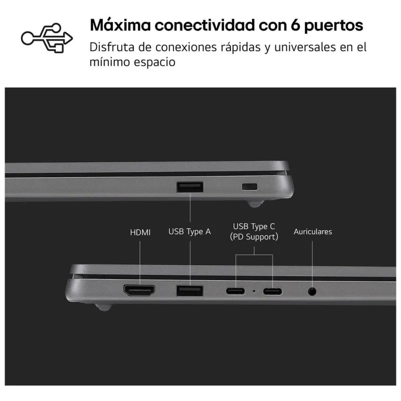 El Ordenador Portátil LG Gram 15UD50T-G.AX55B está preparado para ofrecer una conectividad moderna y completa. Incluye dos puertos USB 3.2 tipo A, dos USB4 Gen 3×2, un puerto HDMI 2.1 y salida para auriculares, lo que facilita la conexión de periféricos y monitores externos. Además, cuenta con conectividad inalámbrica Wi-Fi 6 y Bluetooth 5.2, garantizando una conexión rápida, estable y segura en todo momento. Esta versatilidad de puertos y conexiones lo hace ideal para entornos profesionales y personales donde se requiere flexibilidad y compatibilidad con múltiples dispositivos.