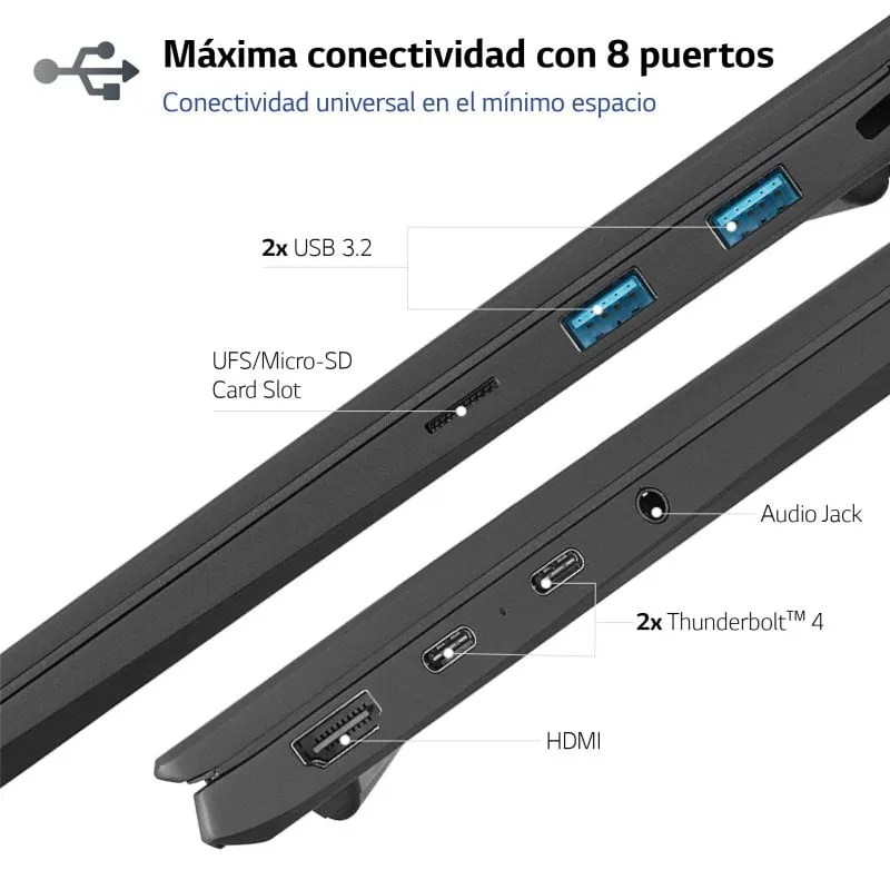MÚLTIPLES PUERTOS DE CONEXIÓN: LG gram ofrece no solo varios puertos sino también dos Thunderbolt™ 4 para la máxima escalabilidad. Experimenta la pantalla 5K con 40GB de velocidad de transferencia mientras cargas dispositivos externos simultáneamente.