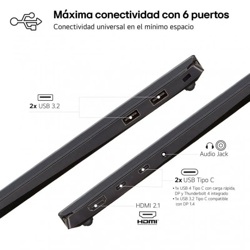 - Alta conectividad con 6 puertos (2 x USB 3.2, USB Tipo C con Thunderbolt 4 integrado para carga ultrarrápida, USB 3.2 Tipo C compatible con DisplayPort1.4, HDMI 2.1.)