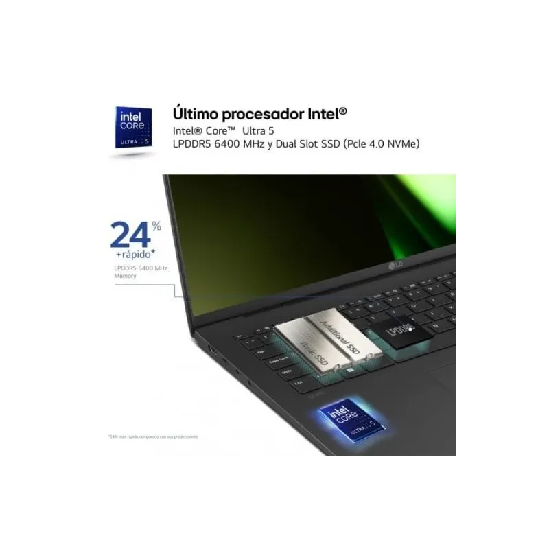 PROCESADOR INTEL® CORE™ ULTRA 7: Experimenta una potencia adaptada a tus exigencias. Con el procesador Intel® Core™ Ultra 7, LG gram te permite obtener un rendimiento a la altura de tu demanda.