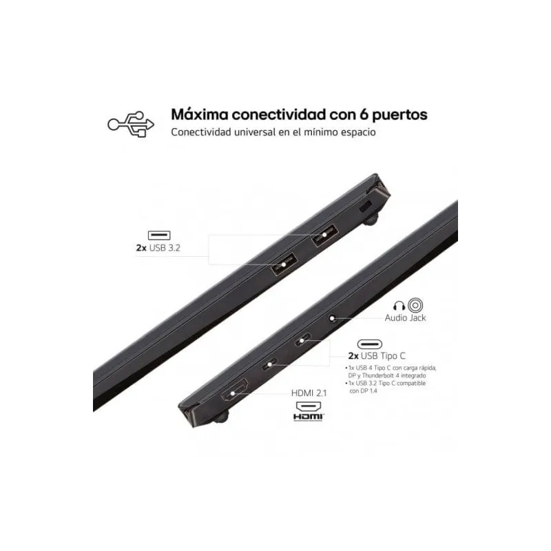 - Alta conectividad con 6 puertos (2 x USB 3.2, USB Tipo C con Thunderbolt 4 integrado para carga ultrarrápida, USB 3.2 Tipo C compatible con DisplayPort1.4, HDMI 2.1.)