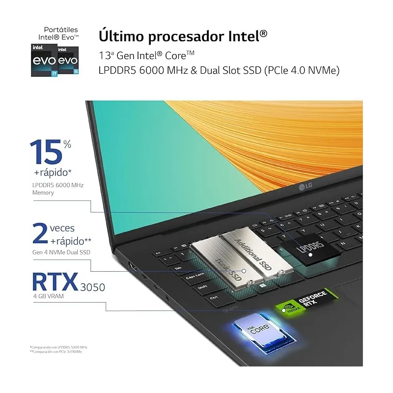 El Ordenador Portátil LG Gram 17Z90R 17Z90R-E.AD75B incorpora una NVIDIA GeForce RTX 3050 con 4 GB de memoria GDDR6, ideal para tareas que requieren potencia gráfica. Ya sea para edición de vídeo en alta resolución, modelado 3D o juegos, esta tarjeta gráfica ofrece un rendimiento estable y eficiente. Su integración con el procesador Intel Core i7 de 13ª generación permite aprovechar al máximo las capacidades del sistema. La combinación de gráficos integrados Intel Iris Xe y GPU dedicada proporciona versatilidad para distintos escenarios de uso sin comprometer calidad ni velocidad.